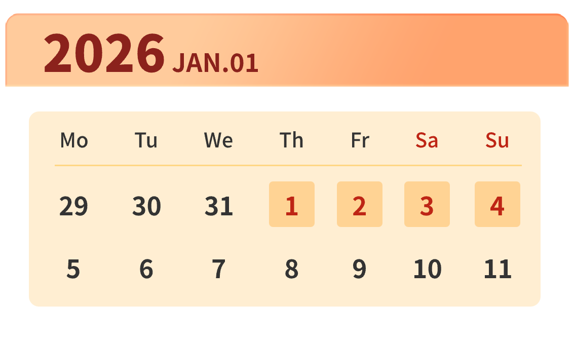 وفقًا لترتيبات العطلات الرسمية الوطنية وبناءً على الظروف الفعلية لشركتنا، نود إبلاغكم بترتيبات عطلة رأس السنة الميلادية 2026 كما يلي: