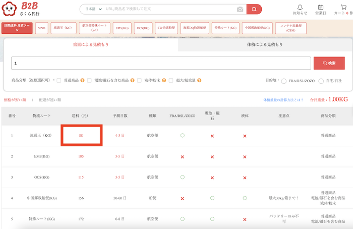 次に、無在庫として中国から日本(顧客)へ商品を送る際の1kgの送料です。