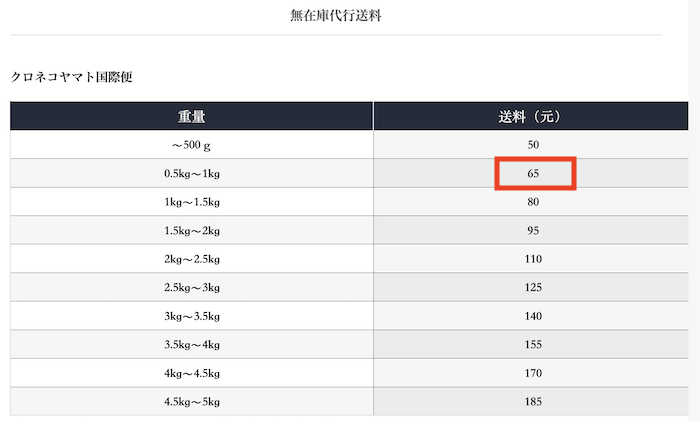 これは、有在庫として中国から日本(自社)へ商品を送る際の1kgの送料です。