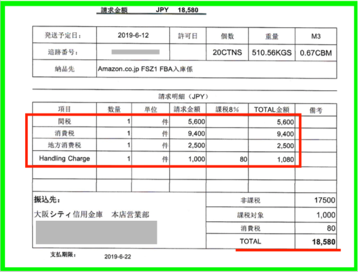 この請求書は通関業者が立替払いをし、商品を事業者様の手元に届けた際に代金引換で回収した分です。