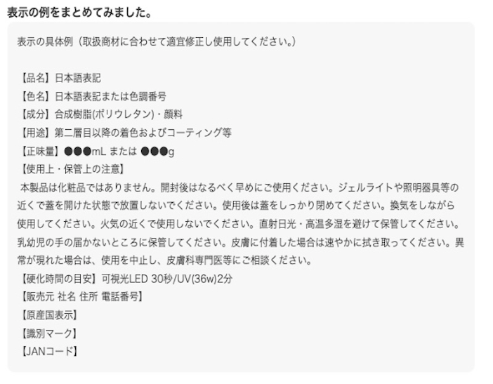 豆知識2:雑貨扱いのジェルネイルにおいても、メーカー責任(販売者責任)において安全性の担保は必須となります。