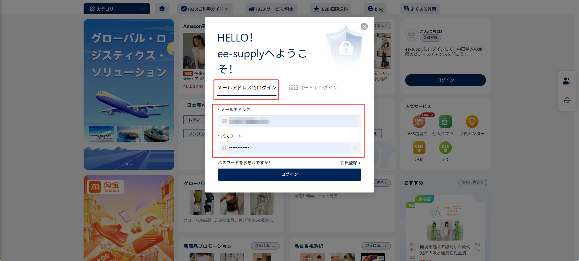 1. 2.Hubbuyerサイトのトップページ左上にある「ログイン」ボタンをクリックすると、ログイン用のポップアップが表示されます。
